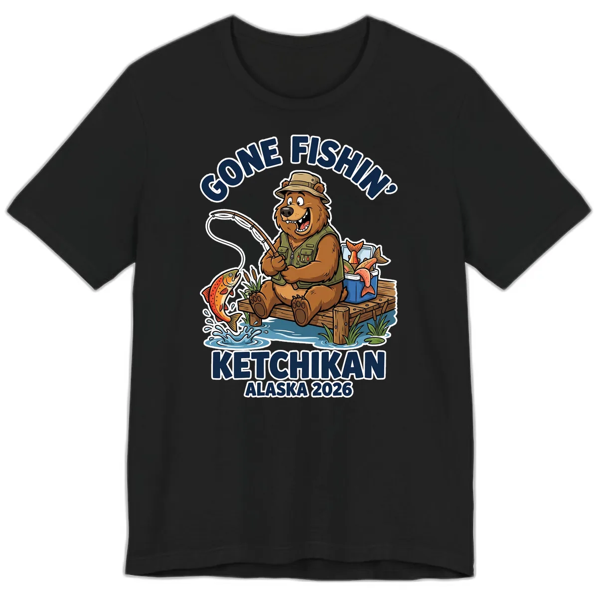 The vibrant 'Gone Fishin' Ketchikan Alaska Bear Fishing' illustration pops beautifully on the premium fabric. The detailed cartoon bear and text are rendered crisply for a great visual impact.