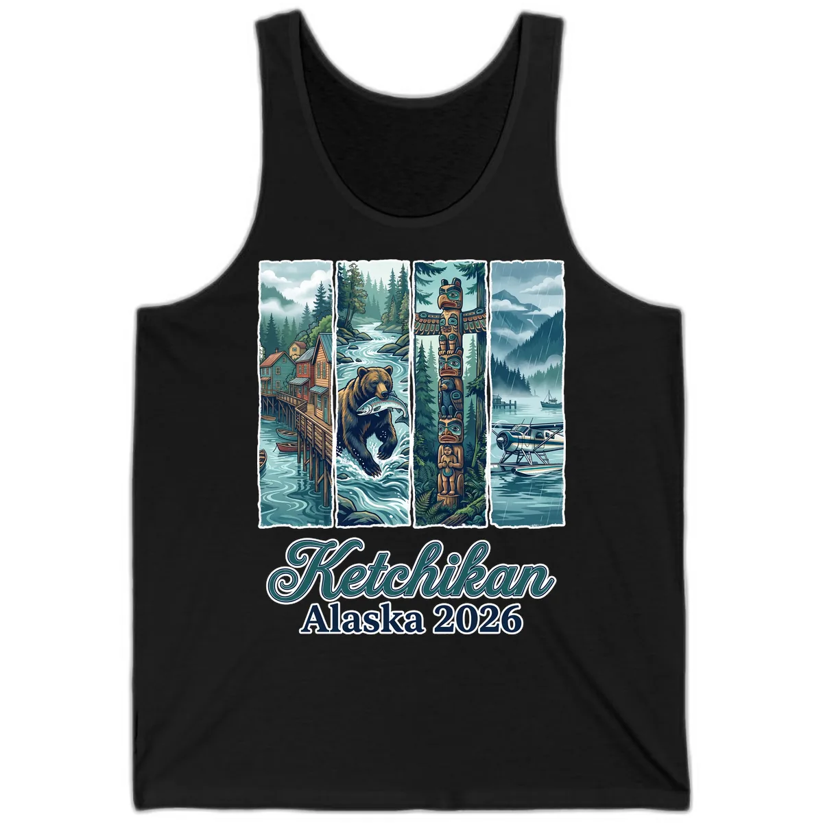 The beautiful four-panel illustration of Ketchikan, Alaska, featuring stilt houses, a bear fishing, totem pole, and seaplanes, is vividly printed on the tank top. The rich teal, green, and gold colors create a striking visual on this casual wear.