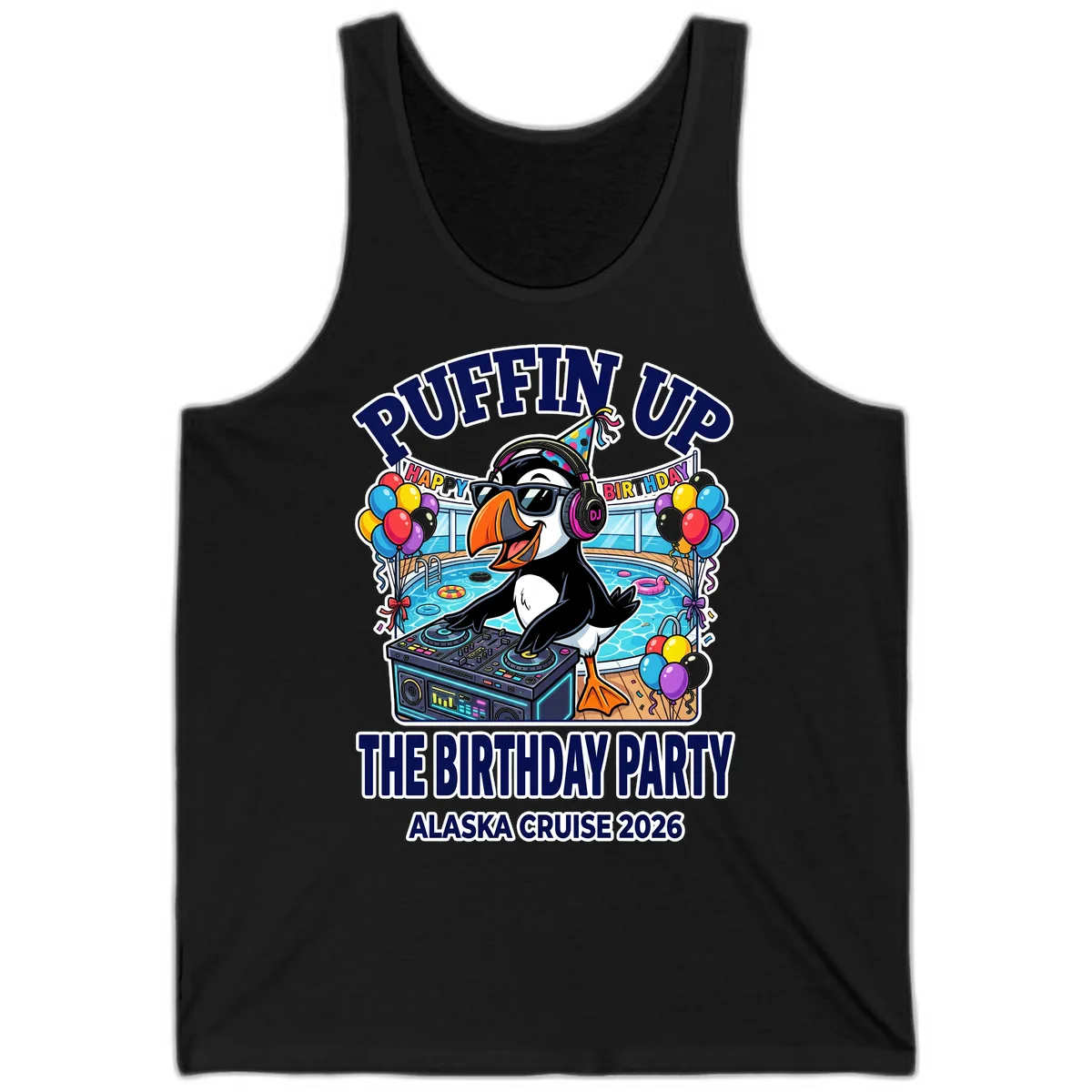 Keep the birthday vibes flowing and stay cool on deck with the Puffin Up The Birthday Party Alaska Cruise Tank! This tank top features a super fun puffin DJ spinning tracks on the cruise ship's pool deck, rocking sunglasses and a party hat – it's the ultimate party starter for DJ’s birthday! Perfect for soaking up the sun and celebrating your special day as you sail through Alaska's stunning scenery. Get ready to dance!