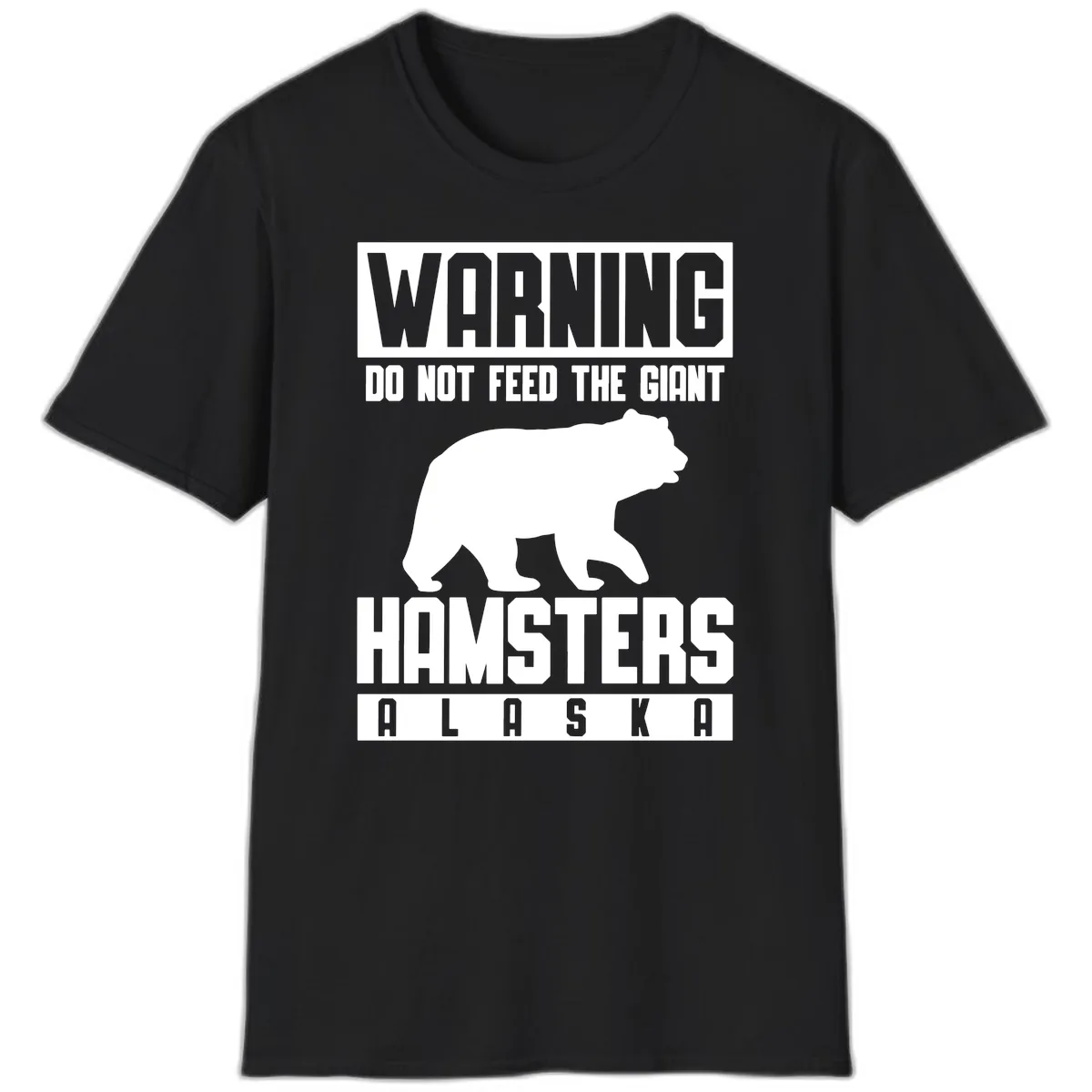 This tee humorously plays on the idea of misidentifying Alaska's wildlife. The design features a bear silhouette, but the text warns against feeding 'giant hamsters,' a funny twist on bear safety warnings.