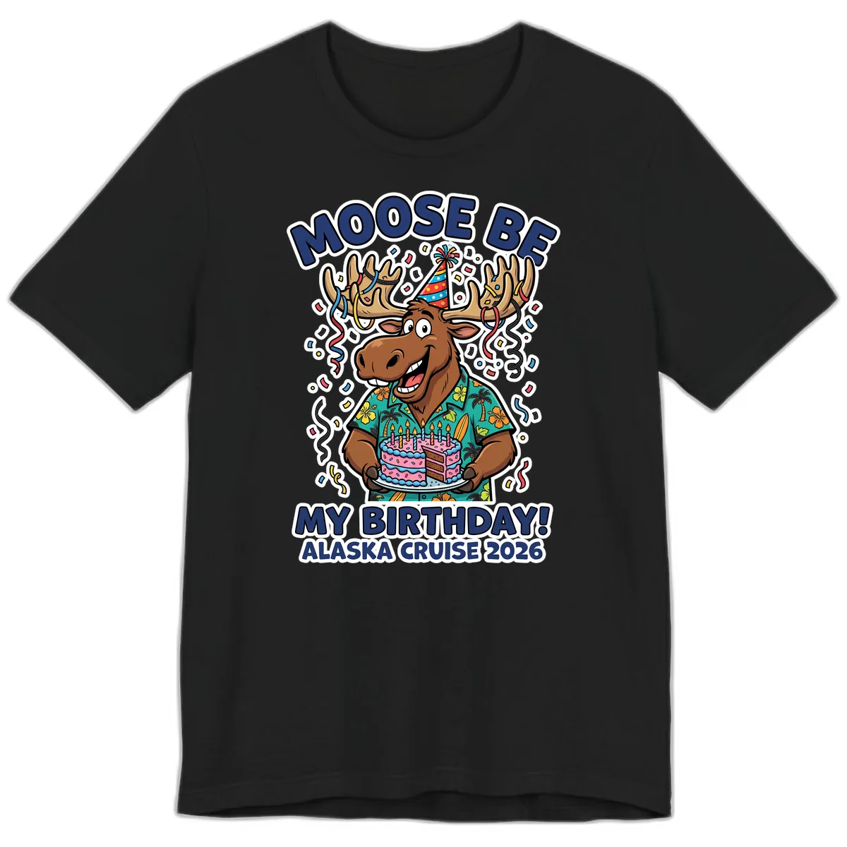 Elevate your Alaska cruise birthday celebration with this premium "Moose Be My Birthday!" tee. Imagine a jubilant cartoon moose, sporting a festive party hat and a vibrant tropical shirt, holding a delicious birthday cake. Surrounded by a whirlwind of confetti, streamers, and ribbons, this design screams fun and festivity. It’s the perfect way to make your 2026 Alaska cruise birthday bash unforgettable, blending Alaskan adventure with pure birthday joy.