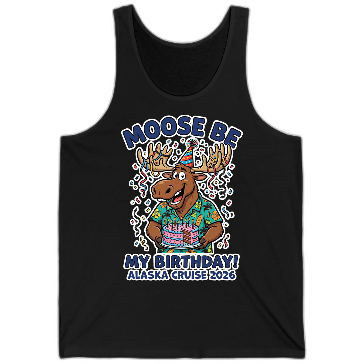 The vibrant 'Moose Be My Birthday Alaska Cruise 2026' design looks fantastic on this tank, offering a fun and festive way to celebrate your birthday while enjoying warmer cruise weather.