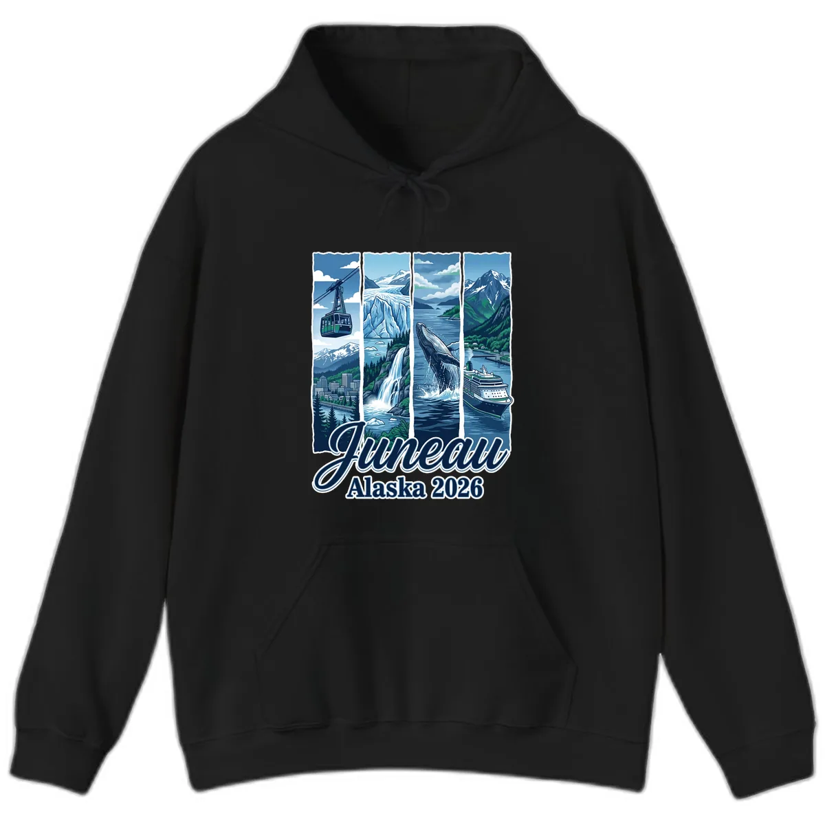Yes, the detailed four-panel collage, including Juneau, glaciers, whales, and the cruise ship, is printed vividly on the hoodie. The 'Juneau Alaska 2026' text makes it a clear and memorable piece of cruise apparel.