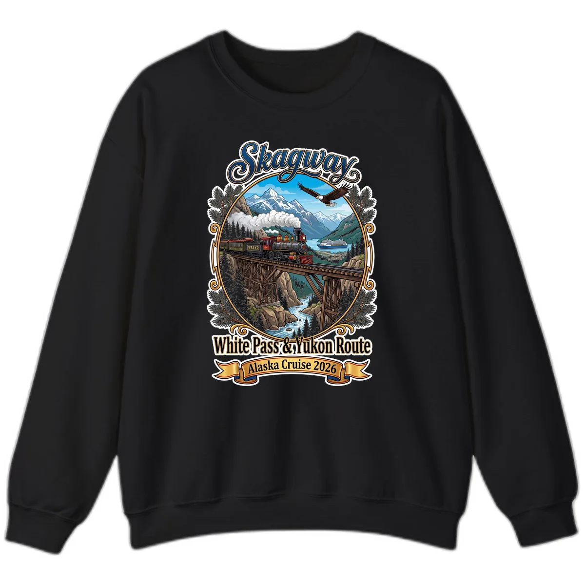 Keep the memories of your Alaskan adventure warm with this Skagway White Pass & Yukon Route Sweatshirt. This cozy crewneck features a stunning vintage-inspired illustration that brings the legendary railway journey to life. Imagine the powerful steam locomotive, the iconic trestle bridge, majestic snow-capped mountains, and a soaring bald eagle – all beautifully rendered to capture the spirit of the White Pass & Yukon Route. It's the perfect way to stay warm and stylish while reminiscing about your 2026 Alaska cruise.