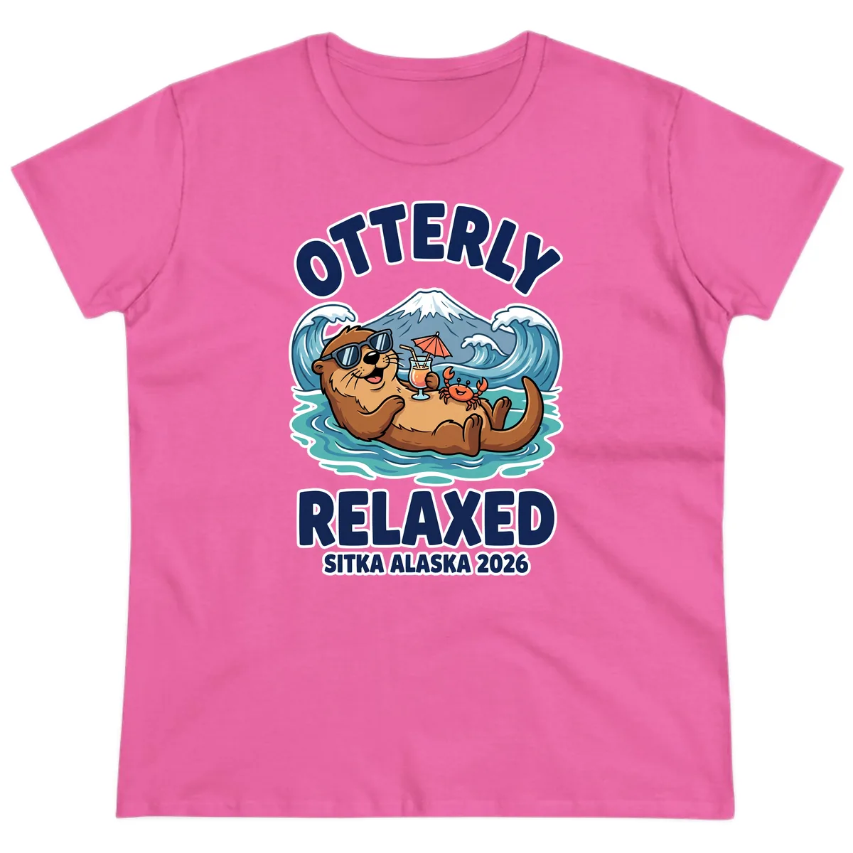The cheerful sea otter lounging with a cocktail looks fantastic on the ladies' fit, adding a playful and relaxed vibe to your cruise attire. The 'OTTERLY RELAXED SITKA ALASKA 2026' text is clearly visible.