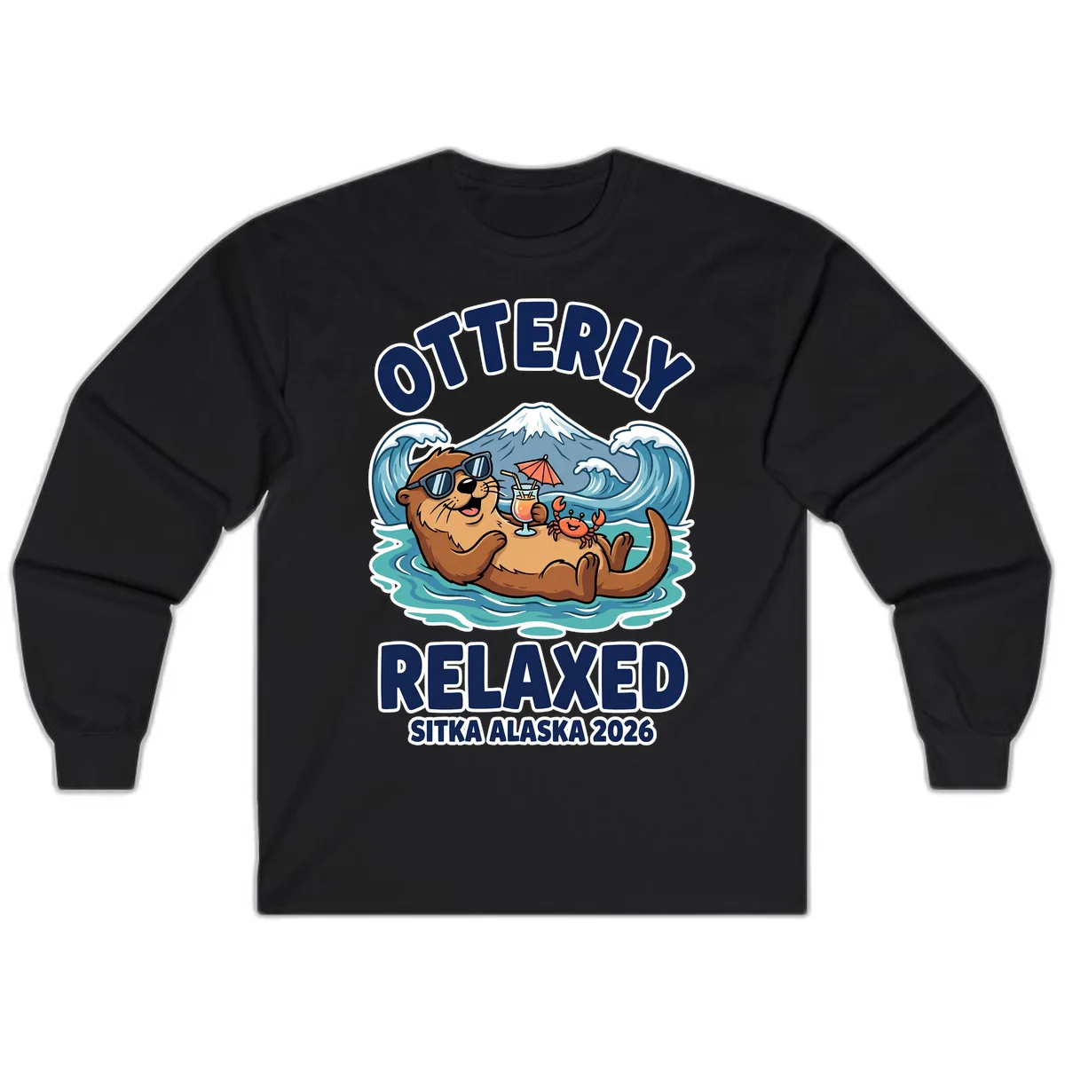 The 'OTTERLY RELAXED SITKA ALASKA 2026' design, featuring the sea otter in sunglasses and its tropical drink, is printed prominently on the chest, ensuring the fun illustration is visible even with the sleeves on.