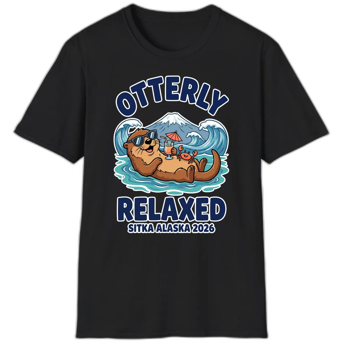 The design showcases a sea otter in sunglasses with a drink, a small crab, ocean waves, and a snow-capped mountain, all set against the playful 'Otterly Relaxed Sitka Alaska 2026' text.
