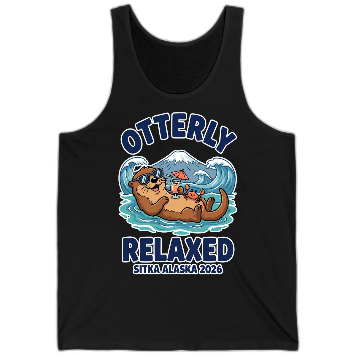The fun 'OTTERLY RELAXED SITKA ALASKA 2026' design, featuring the sea otter with sunglasses and a cocktail, is printed vibrantly on the tank. It's a playful way to show off your vacation mood.