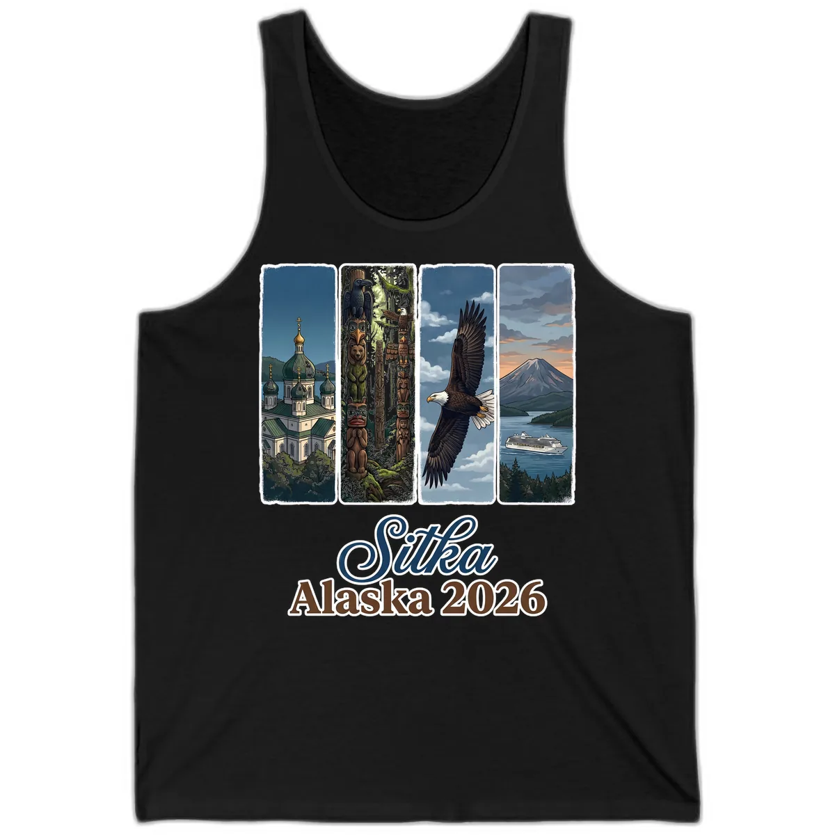 Stay cool and stylish on your 2026 Alaska cruise with this vibrant tank top, a perfect souvenir showcasing the heart of Sitka. The eye-catching four-panel design beautifully captures the essence of this unique Alaskan destination, blending its rich cultural heritage with stunning natural landscapes.