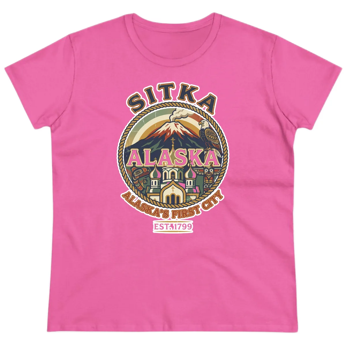 Embrace the allure of Sitka, Alaska with this beautifully designed ladies' tee, featuring a stunning vintage-inspired badge. It’s the perfect blend of historical charm and fashionable comfort, ideal for commemorating your visit to 'Alaska's First City'.