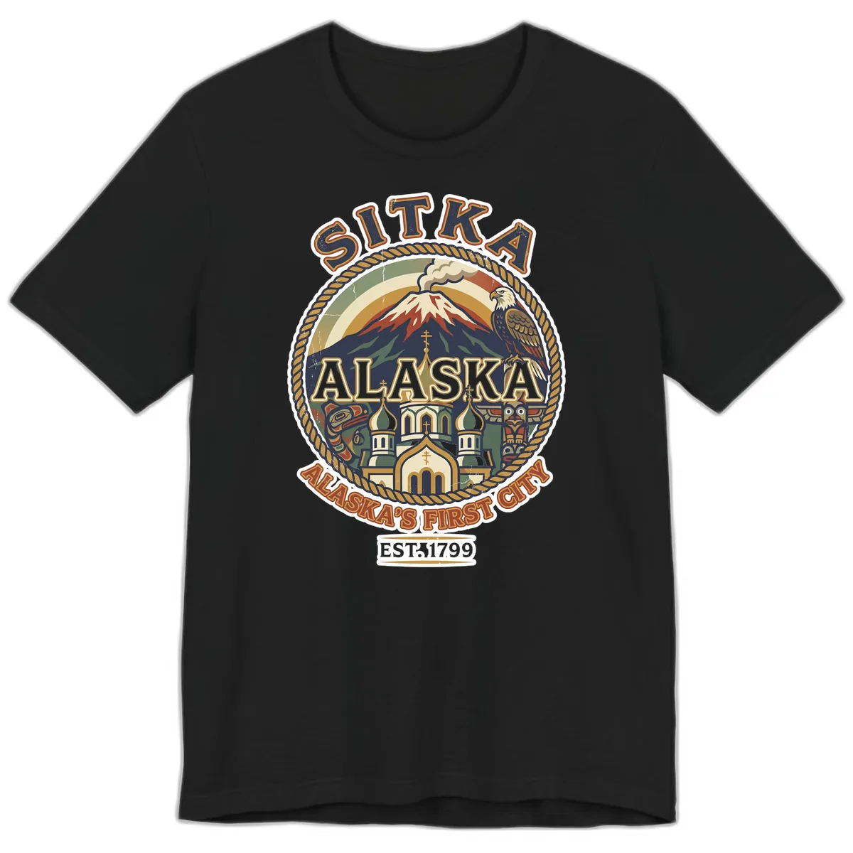 Yes, the premium t-shirt includes the full vintage-inspired circular badge design, complete with the volcano, church, eagle, totem art, and 'Sitka Alaska's First City EST. 1799' text.