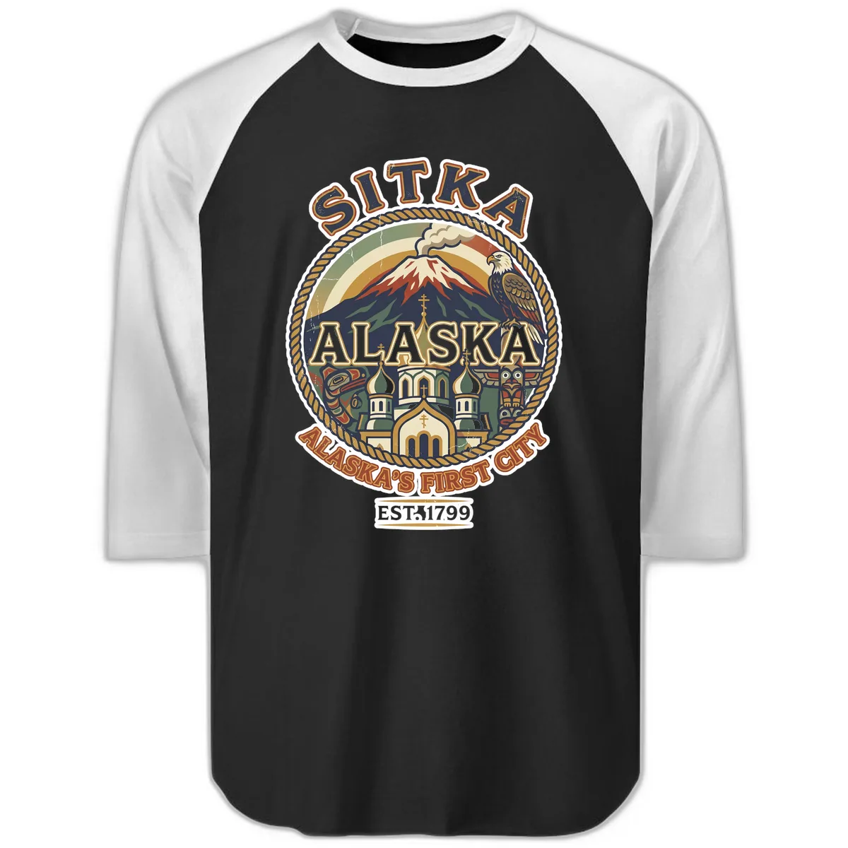 The Sitka Alaska's First City Badge design is prominently featured on the body of the raglan tee, showcasing all its detailed elements like the volcano, church, eagle, and totem art.