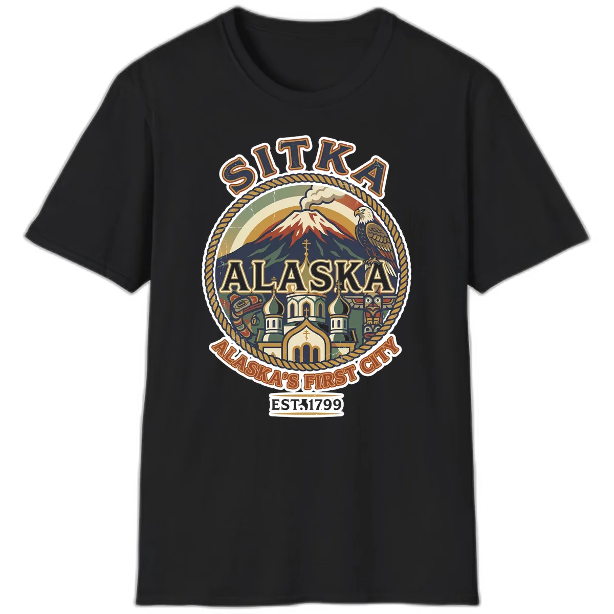 Yes, this t-shirt is designed to celebrate Sitka, Alaska, featuring its name prominently along with 'Alaska's First City' and historical elements.