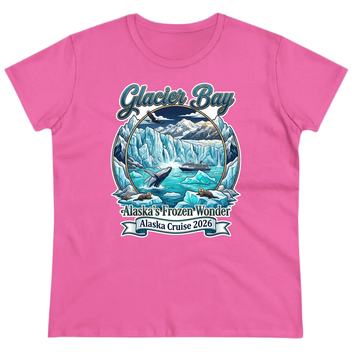 Ladies, get ready to capture the magic of Glacier Bay with this stunning Alaska's Frozen Wonder Ladies Tee! Designed to celebrate your 2026 cruise, this shirt features a breathtaking scenic illustration of Alaska's icy wonders, from towering glaciers to playful sea otters and a majestic bald eagle. It’s the perfect blend of adventure and style.