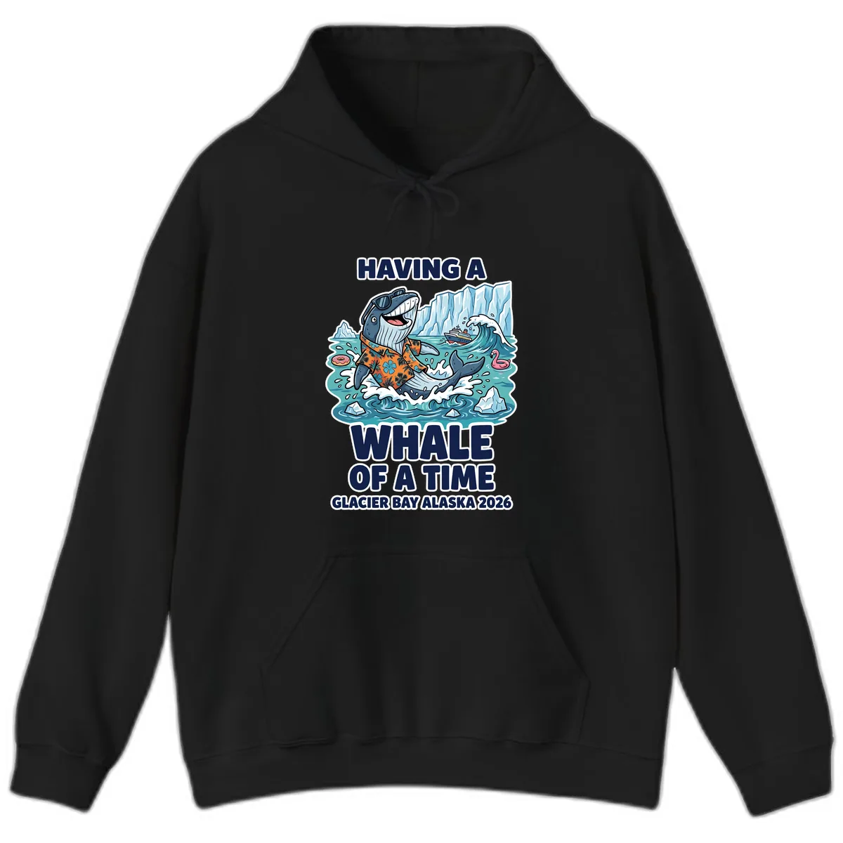 The vibrant illustration of the whale, sunglasses, Hawaiian shirt, and Glacier Bay elements stands out clearly on the front of the hoodie. It's a fun and eye-catching design for your cruise.