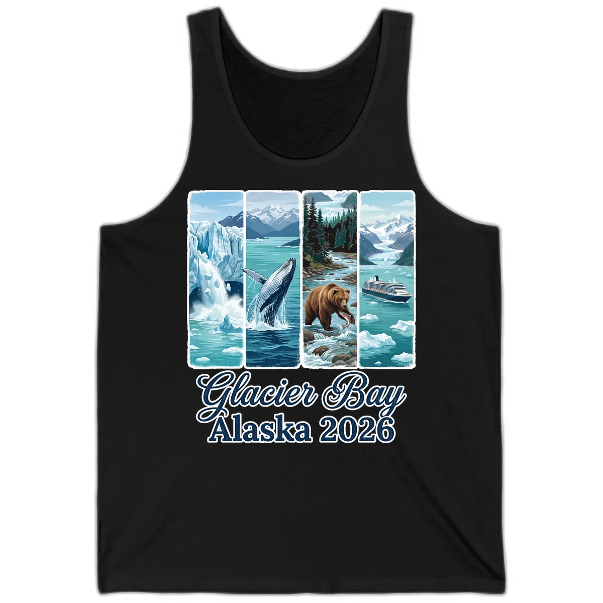 The striking four-panel illustration of Glacier Bay, featuring glaciers, a whale, a bear, and the cruise ship, along with the 'Glacier Bay Alaska 2026' text, is printed on this breathable tank.