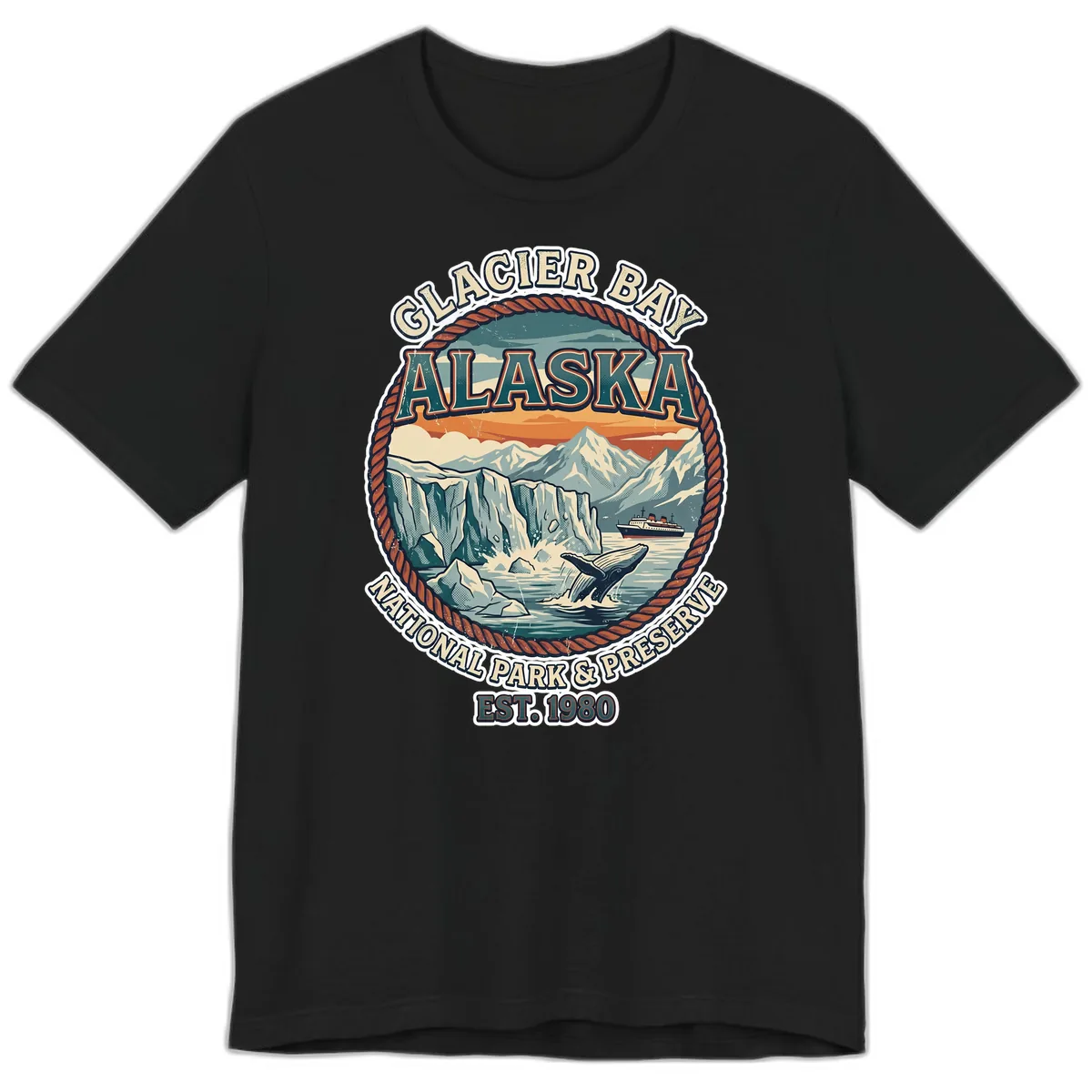 Elevate your Alaska cruise experience with this premium Glacier Bay National Park & Preserve tee. The design boasts a captivating vintage badge, showcasing the park's dramatic glacier cliffs, snow-capped peaks, a majestic whale, and a cruise ship sailing through pristine waters. Rendered in a rich retro palette, this shirt is a stylish nod to your unforgettable journey.