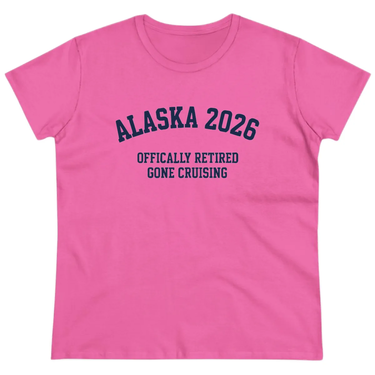 The bold athletic typography, including 'ALASKA 2026' and 'OFFICIALLY RETIRED GONE CRUISING,' is designed to stand out clearly on the ladies' tee, ensuring your retirement message is seen and celebrated.