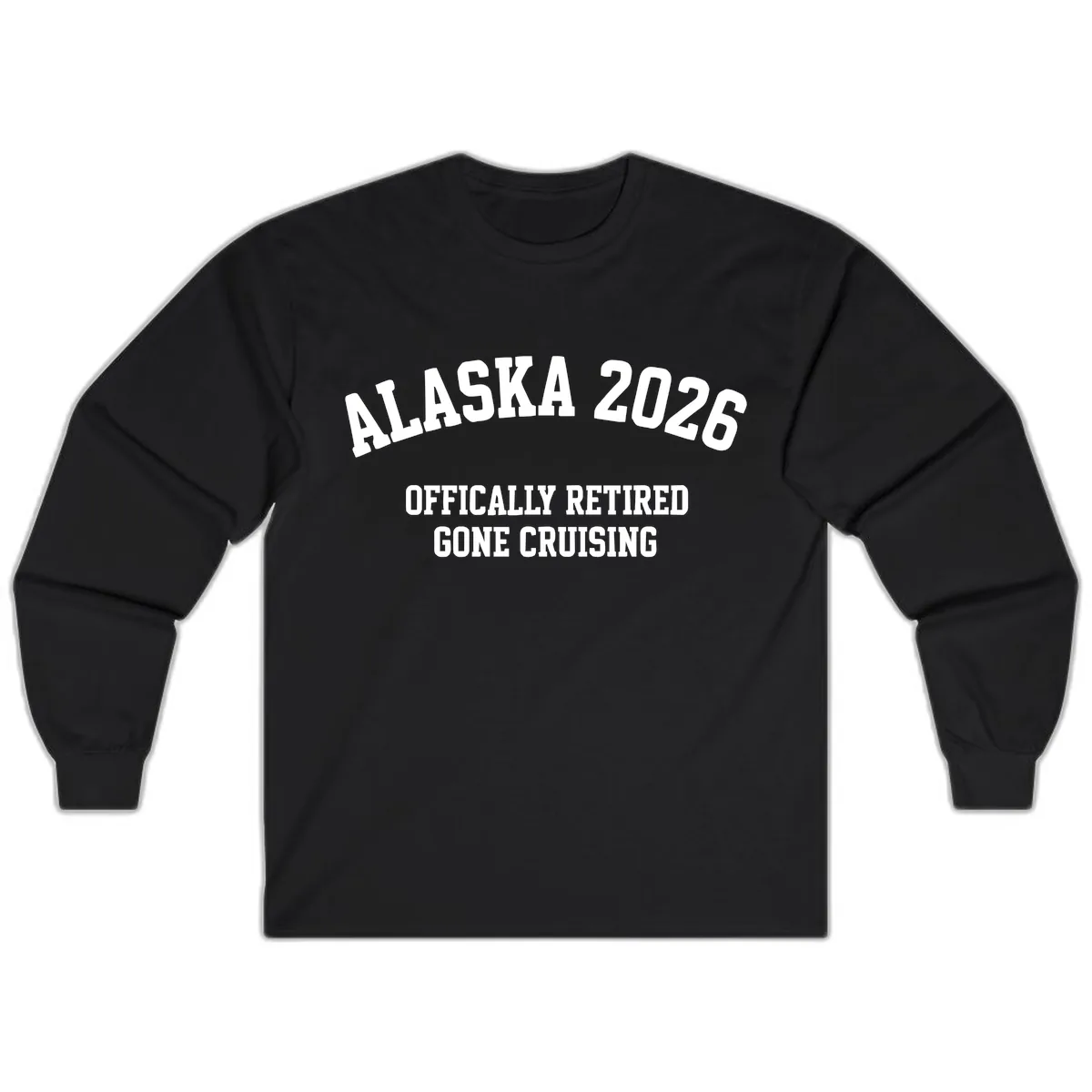 Yes, the bold athletic typography with 'ALASKA 2026' angled large and 'OFFICIALLY RETIRED GONE CRUISING' below is designed to be highly visible on the long sleeves, making a clear statement about your retirement vacation.