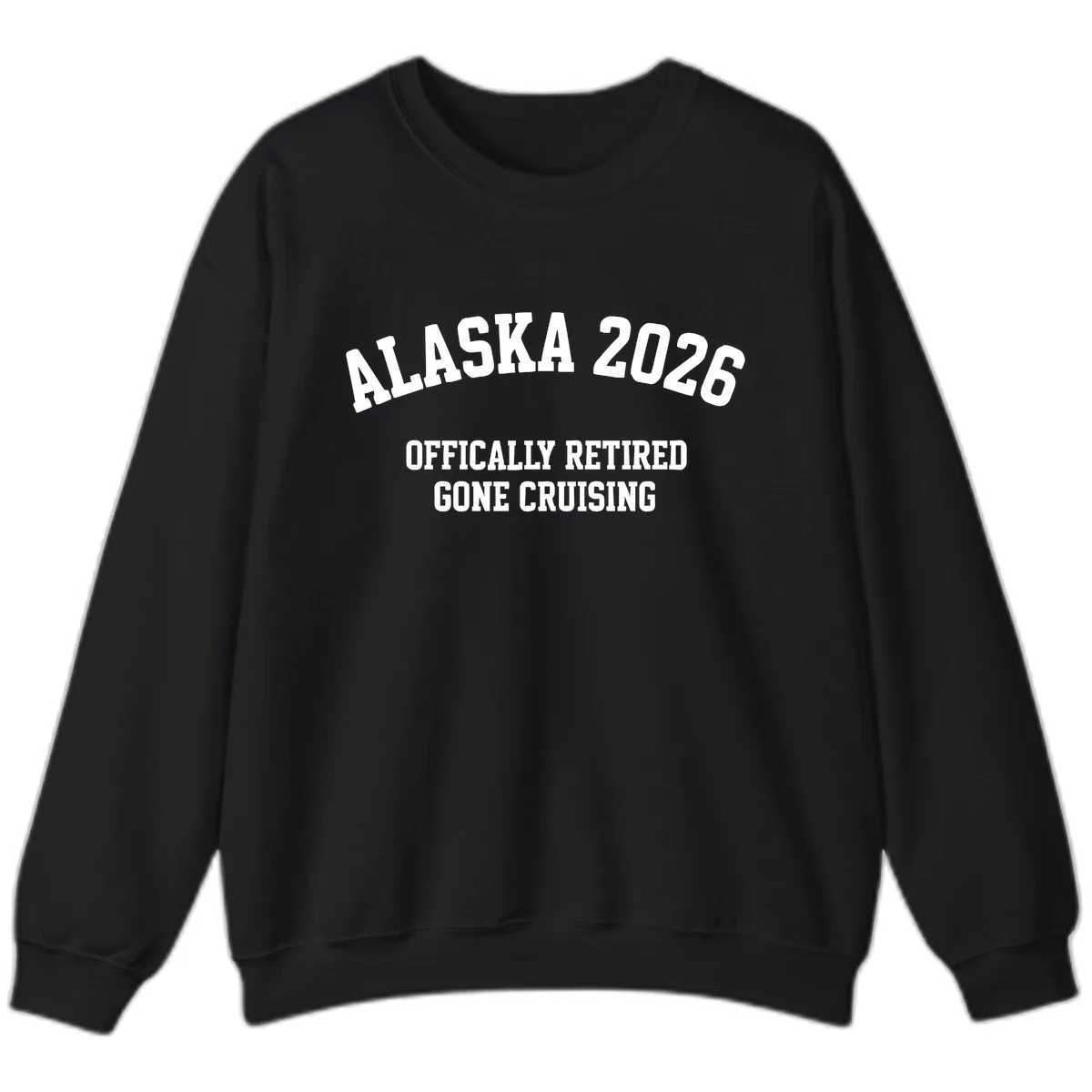 Yes, the bold athletic typography of 'ALASKA 2026 OFFICIALLY RETIRED GONE CRUISING' makes a strong statement on the sweatshirt. The design is printed to be durable and clearly visible on the cozy fabric.