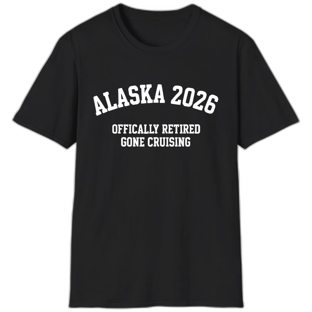 This t-shirt is designed specifically for retirees heading to Alaska in 2026! The bold athletic text clearly announces your 'Officially Retired' and 'Gone Cruising' status, making it a fun statement piece for your vacation.