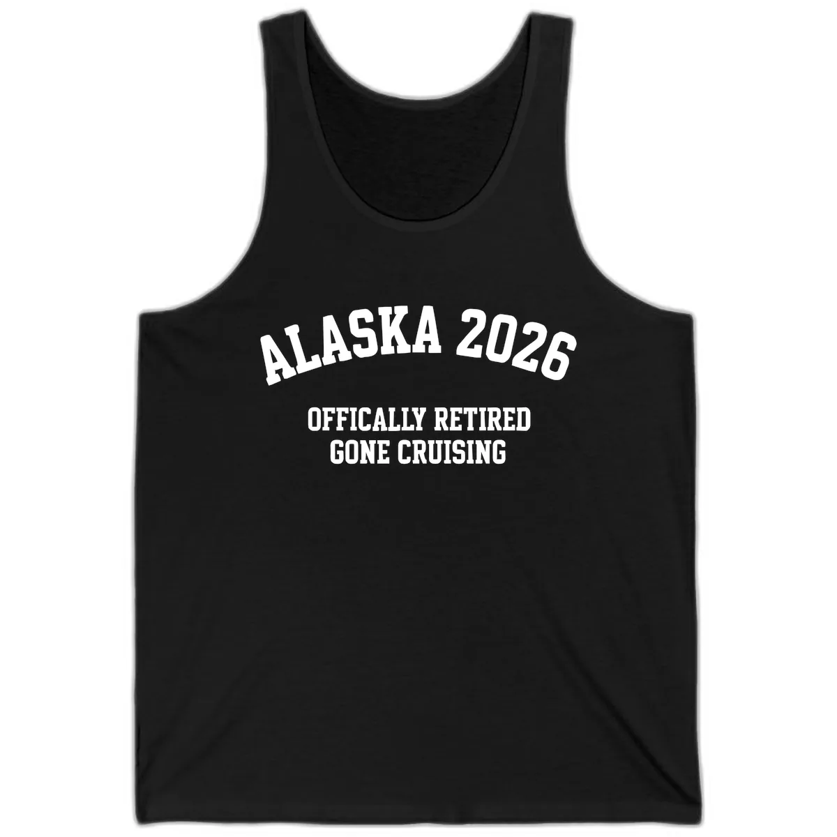 The bold athletic typography, including 'ALASKA 2026' and 'OFFICIALLY RETIRED GONE CRUISING,' is printed clearly on the tank, making your retirement announcement fun and visible, even in warmer weather.