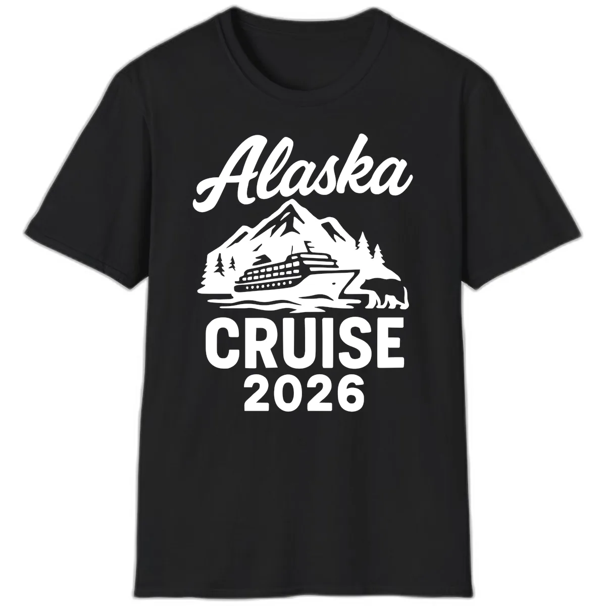 The T-shirt features a scenic design with a large cruise ship, snow-capped mountains, evergreen trees, a bear, and ocean waves. The text 'Alaska' and 'CRUISE 2026' are prominently displayed.