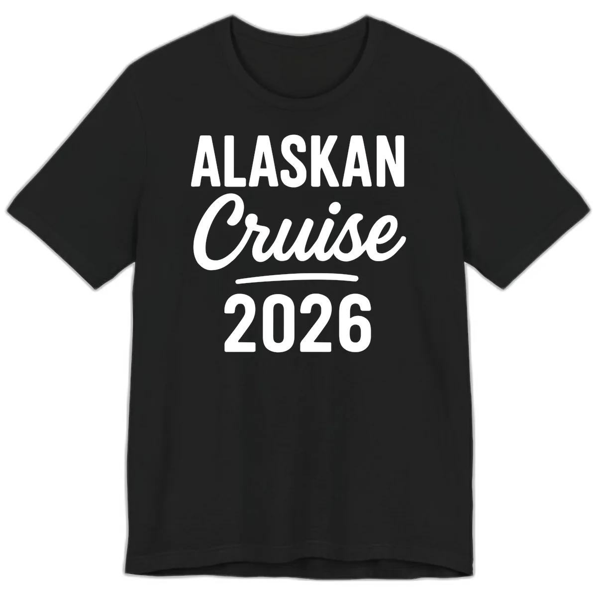 The 'ALASKAN Cruise 2026' design features bold white lettering with a decorative underline, standing out clearly on the shirt. The typography mix adds a stylish touch to this premium cruise apparel.