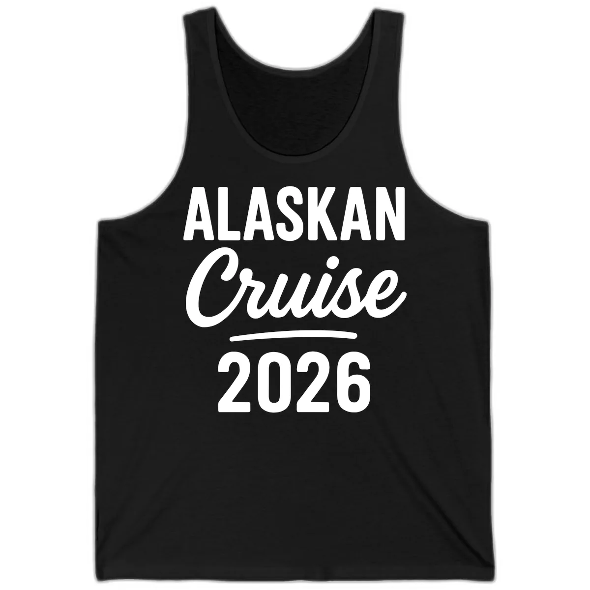 The 'ALASKAN Cruise 2026' design features bold white typography with a decorative underline, printed clearly on the front of the tank. The clean design stands out well on this casual wear piece.