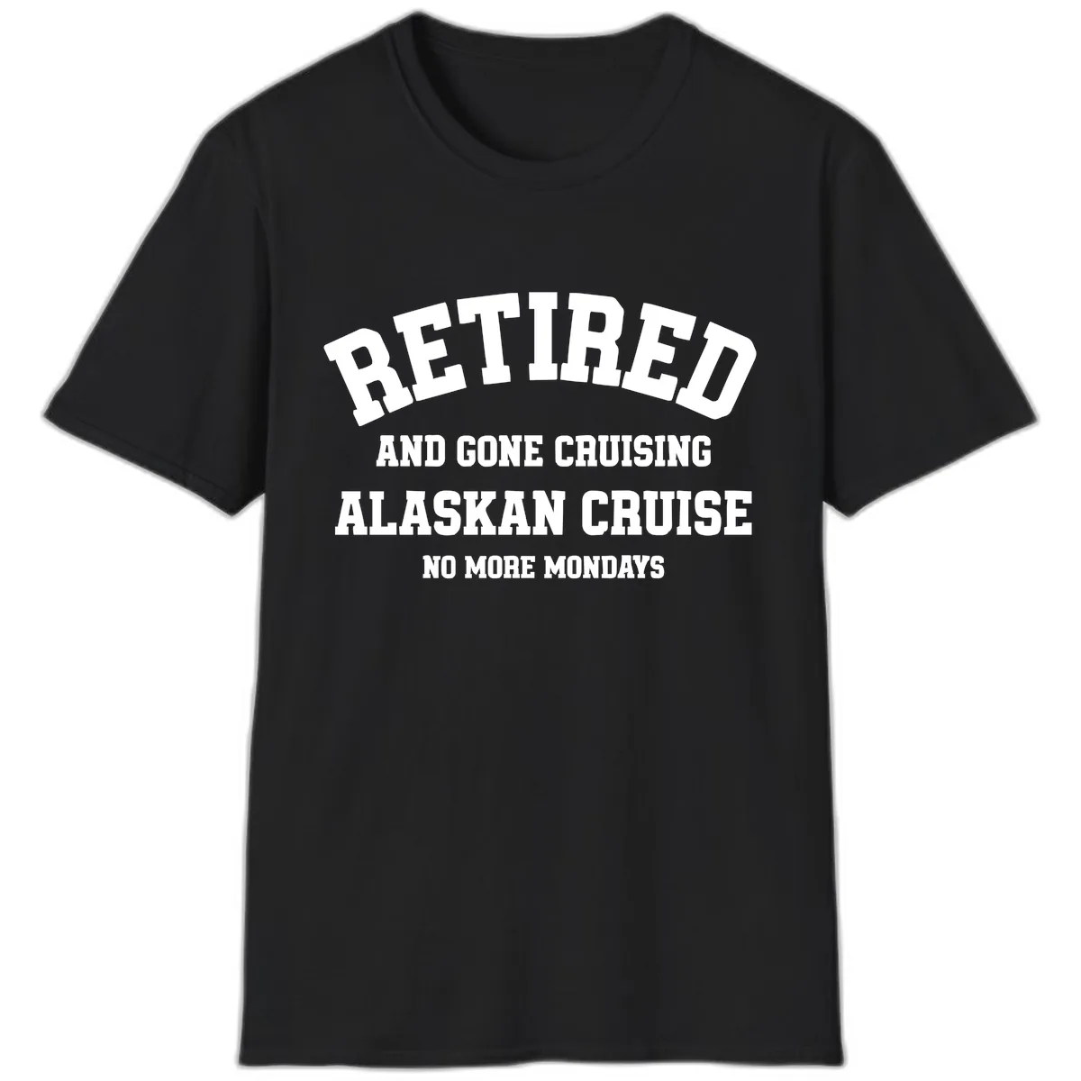 This t-shirt celebrates retirement and the freedom of an Alaska cruise. It clearly states 'Retired And Gone Cruising' and humorously declares 'No More Mondays!'