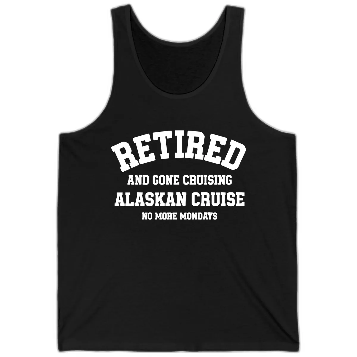 The bold white arched typography, featuring 'Retired And Gone Cruising Alaskan Cruise No More Mondays', is clearly displayed on the front of the tank, making a fun statement about your retirement travels.