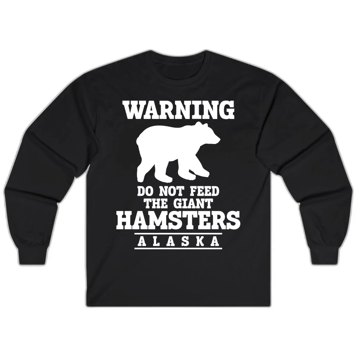 The bold 'WARNING DO NOT FEED THE GIANT HAMSTERS ALASKA' design is prominently displayed, offering a fun and humorous statement. The graphic works well with the extended sleeves for a complete look.