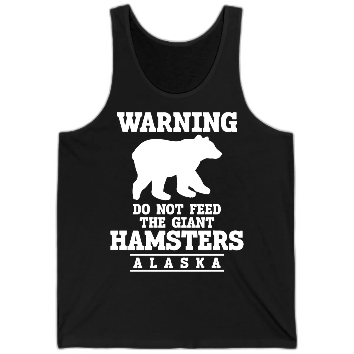 The funny 'WARNING DO NOT FEED THE GIANT HAMSTERS ALASKA' design is printed clearly on the front of the tank top. It makes a bold and humorous statement, perfect for a vacation vibe.