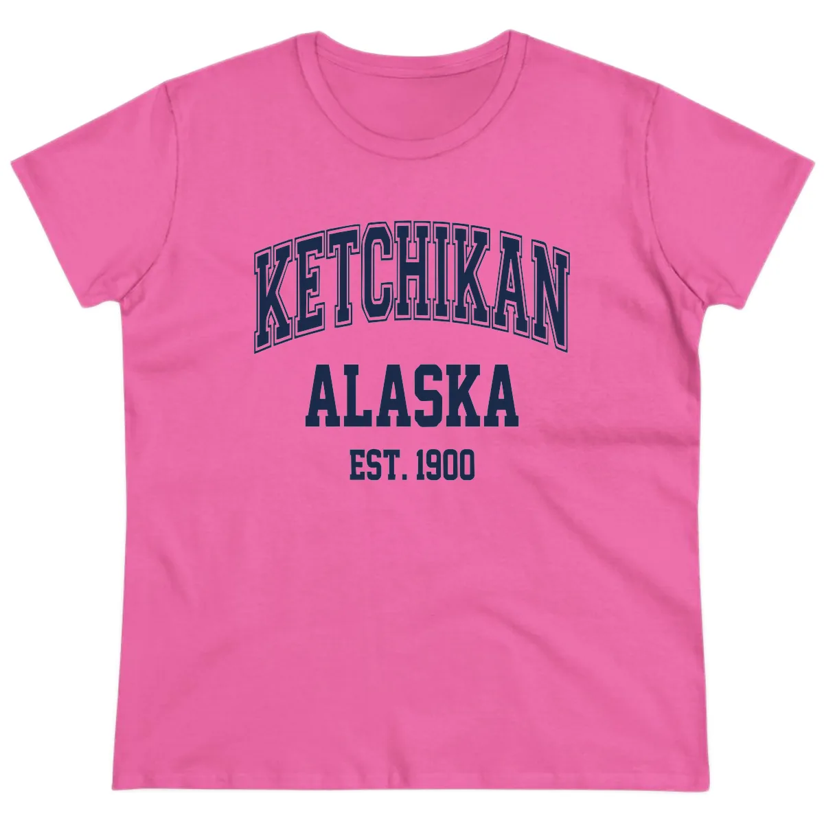 The bold 'KETCHIKAN ALASKA EST. 1900' text and vintage athletic typography are perfectly scaled for the Ladies Tee. The outlined lettering and arrow accents create a striking look on this specifically fitted shirt.