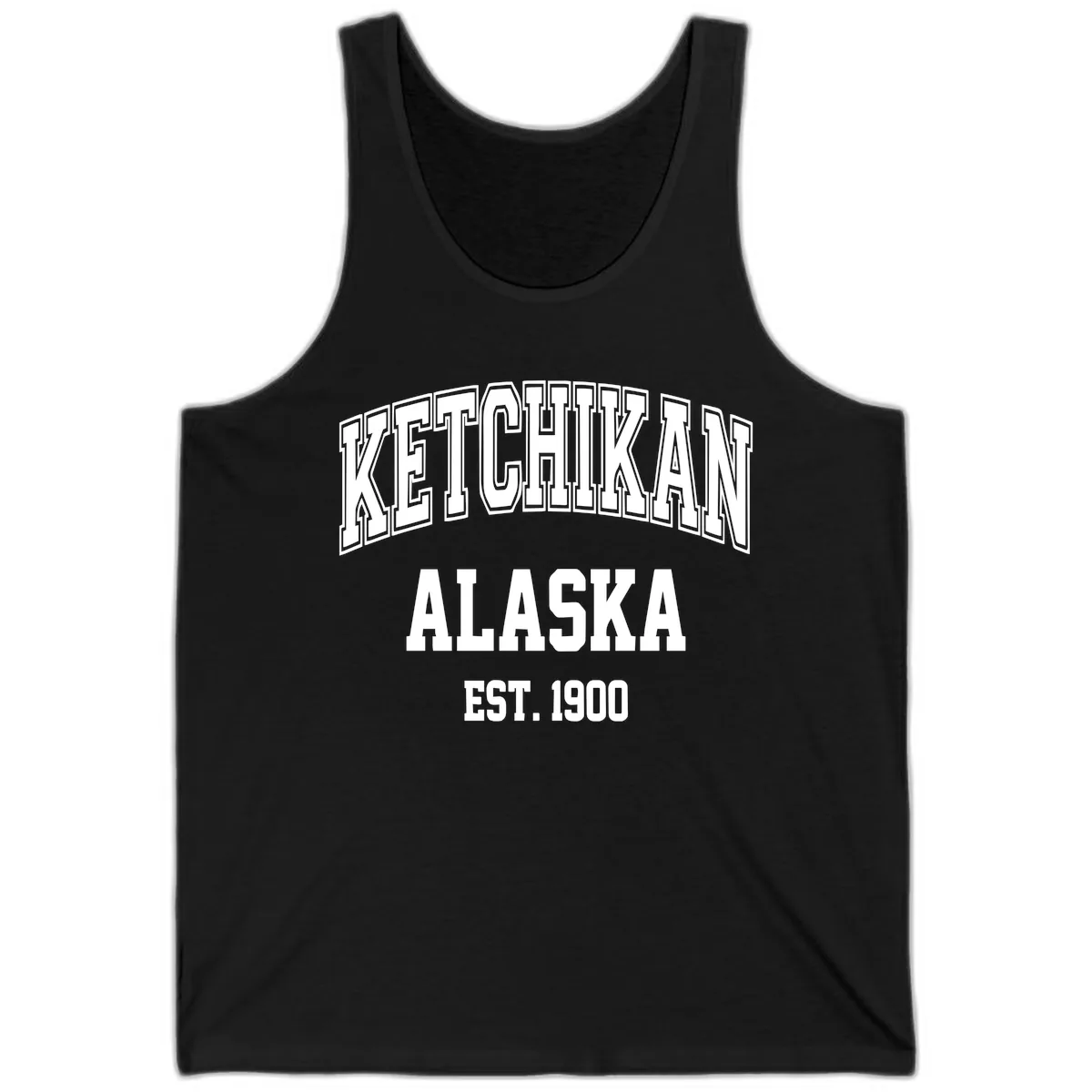 The bold 'KETCHIKAN ALASKA EST. 1900' design looks striking on this tank top. The vintage athletic typography with outlined letters and arrow accents creates a stylish, eye-catching graphic.
