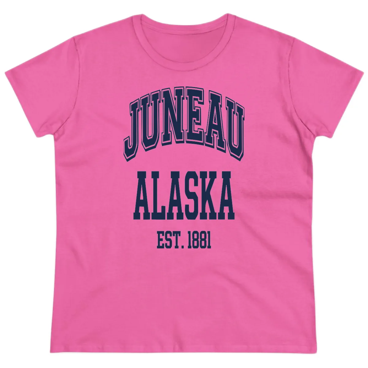 Sail in style with this flattering Juneau At Alaska Est 1881 Ladies Tee! Designed with a feminine fit, it showcases a bold, vintage-inspired badge design featuring 'JUNEAU AT ALASKA EST 1881' in eye-catching 3D-style outlined lettering. This tee is the perfect way for ladies to rep their favorite Alaskan cruise port with a touch of retro flair.