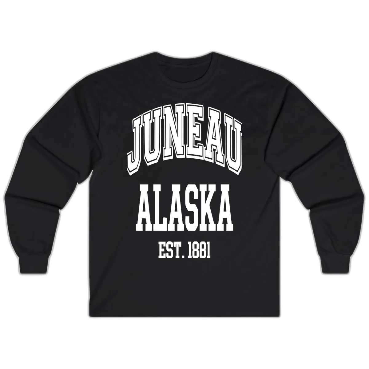 The design features bold, 3D-style outlined lettering of 'JUNEAU AT ALASKA EST 1881' with a vintage badge aesthetic. The dimensional typography stands out clearly on the long sleeves.