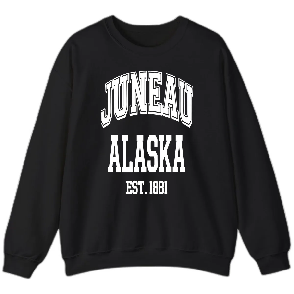 Keep the chill at bay and your memories warm with this Juneau At Alaska Est 1881 Crewneck Sweatshirt! Featuring bold, 3D-style outlined lettering, this design sports a cool vintage badge aesthetic that celebrates Juneau, Alaska. It's the ultimate cozy companion for your Alaskan cruise adventure.