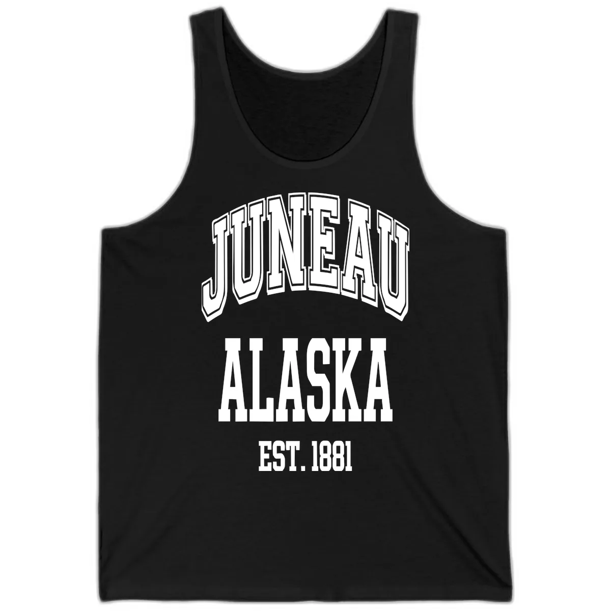 The bold, 3D-style outlined lettering of 'JUNEAU AT ALASKA EST 1881' makes a strong statement on this tank. The vintage badge aesthetic is clear and eye-catching.