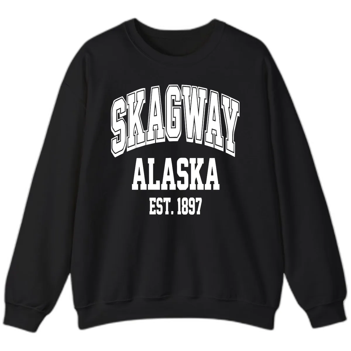 The bold, vintage badge design featuring 'SKAGWAY ALASKA EST. 1897' and decorative arrows looks fantastic on a sweatshirt. The design stands out clearly, offering a cozy yet stylish tribute to your visit.