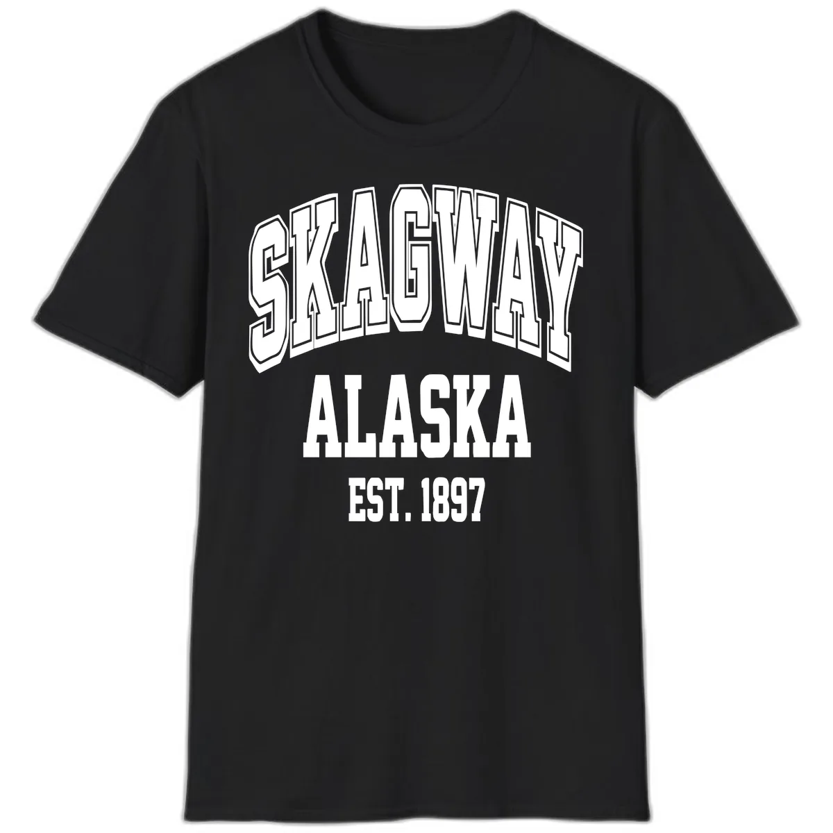 The 'EST. 1897' text highlights Skagway's rich history, particularly its role in the Klondike Gold Rush. Wearing this shirt is a subtle nod to the town's storied past.