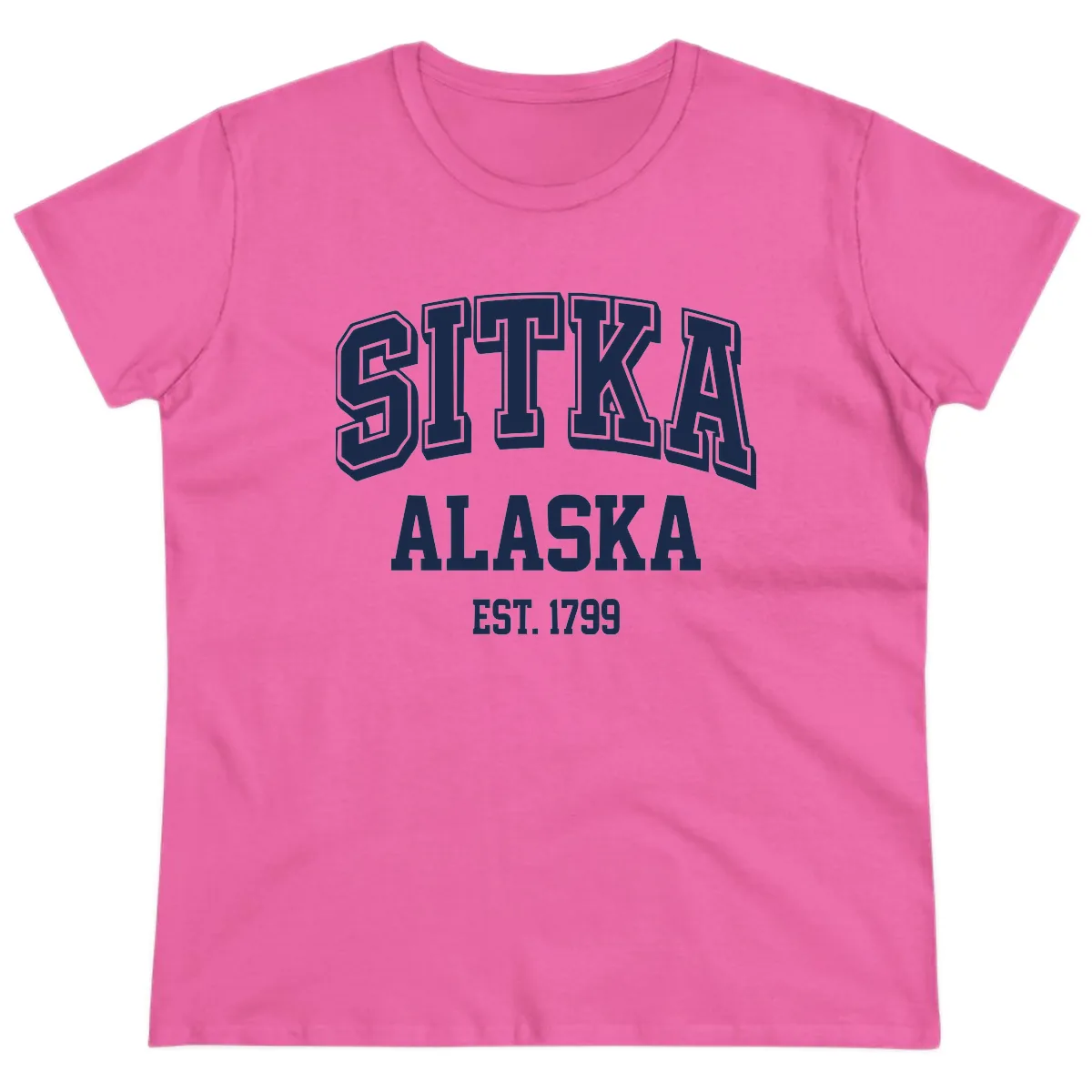 Cruise in comfort and style with this ladies' tee featuring the Sitka Alaska Est 1799 Vintage Badge design. Designed specifically for a flattering women's fit, this shirt combines a fun, vintage varsity athletic aesthetic with the historical charm of Sitka, Alaska. The bold "SITKA ALASKA EST. 1799" graphic is perfect for showing off your port pride.