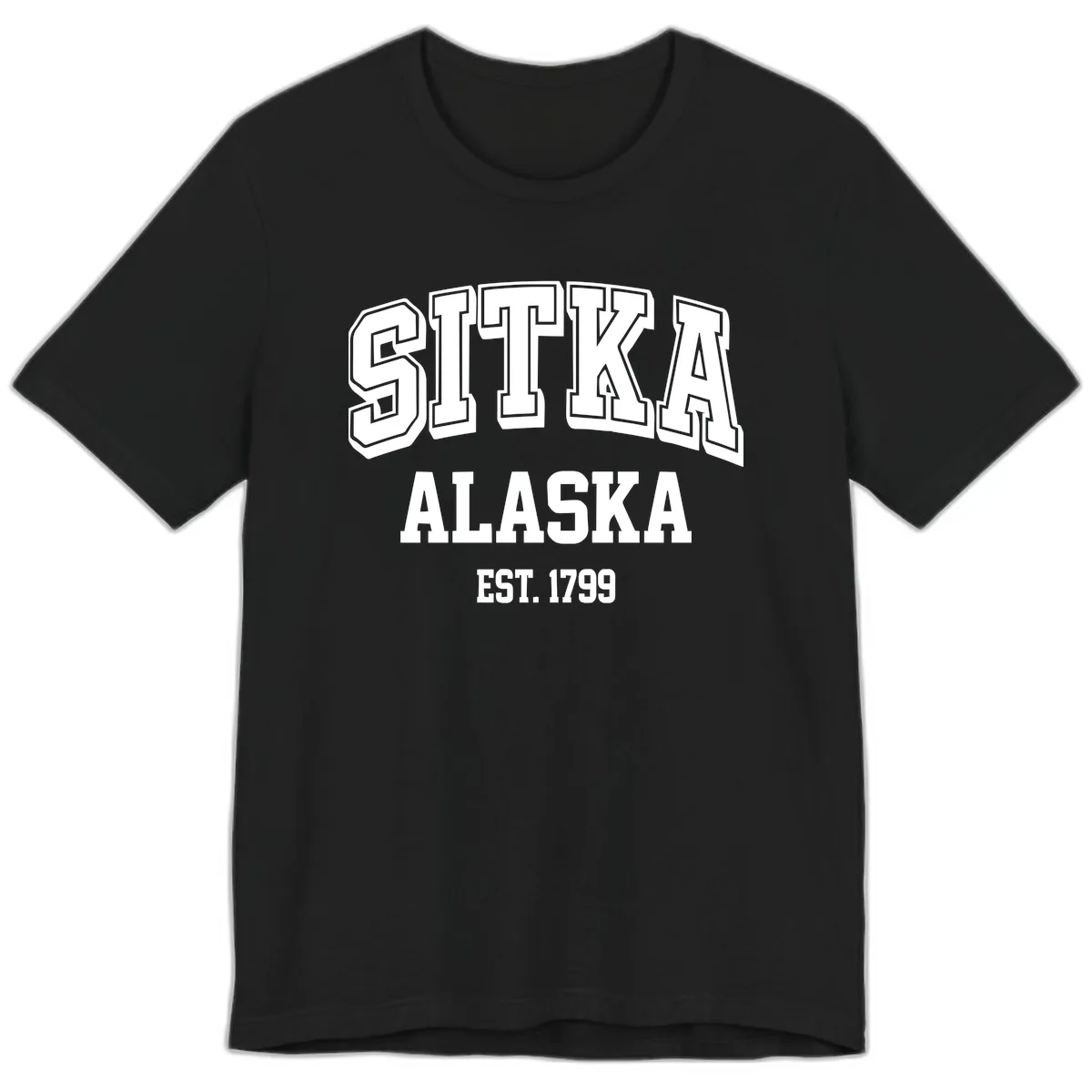 Embrace the historical charm of Sitka, Alaska, with our premium vintage badge tee. This shirt boasts a striking design with bold, outlined block letters spelling out "SITKA ALASKA EST. 1799," all set against a cool gray background. It’s the perfect blend of vintage athletic style and Alaskan adventure, designed for comfort and durability.