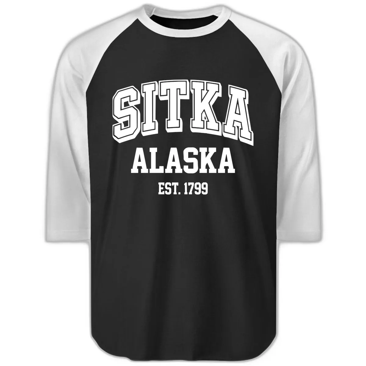 The vintage badge design, with its bold 'SITKA ALASKA EST. 1799' text and clean varsity lettering, perfectly matches the athletic aesthetic of the raglan style, giving it a classic baseball tee vibe.