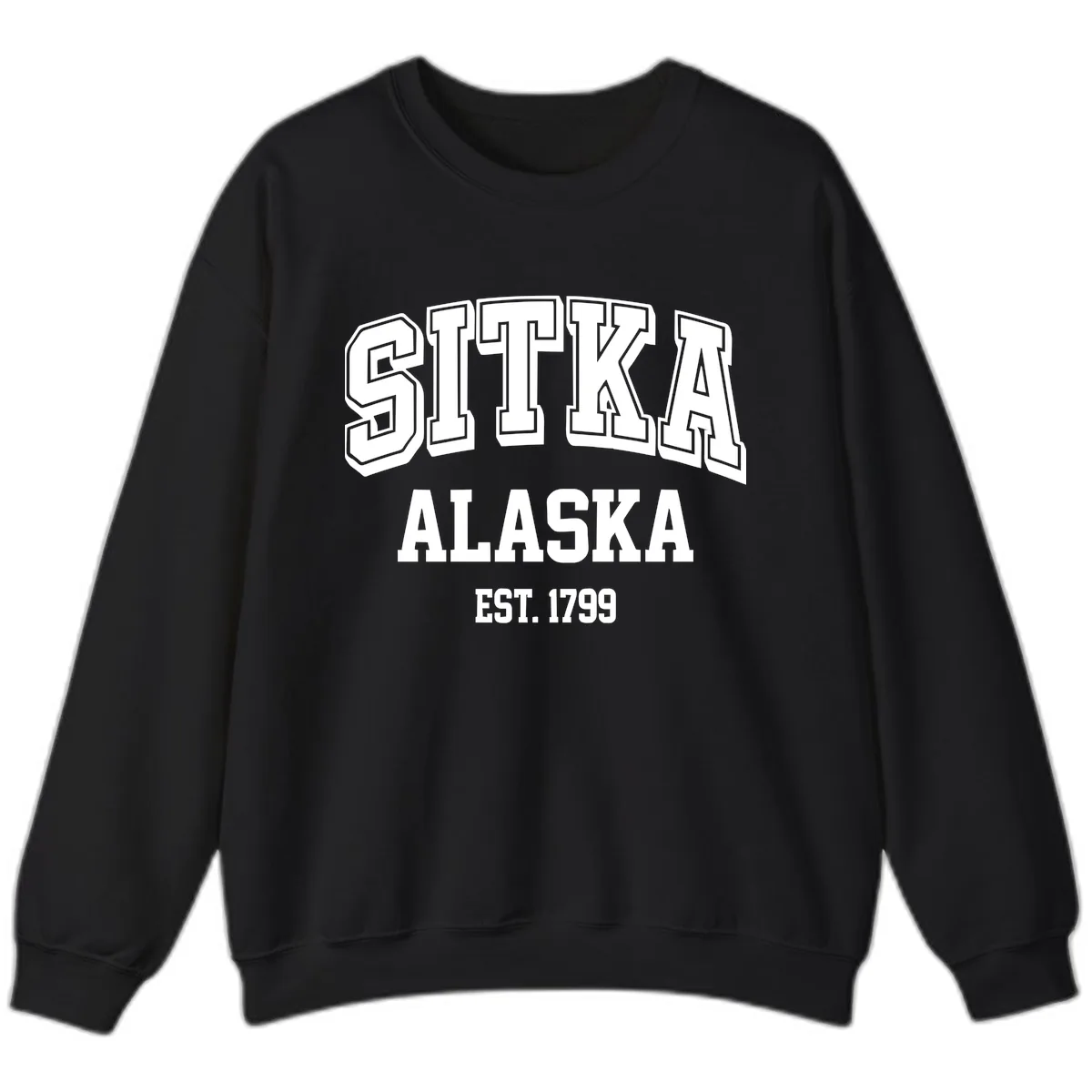 The bold vintage badge design, featuring 'SITKA ALASKA EST. 1799' in classic varsity lettering, is printed clearly on the sweatshirt. It stands out well against the fabric for a stylish look.