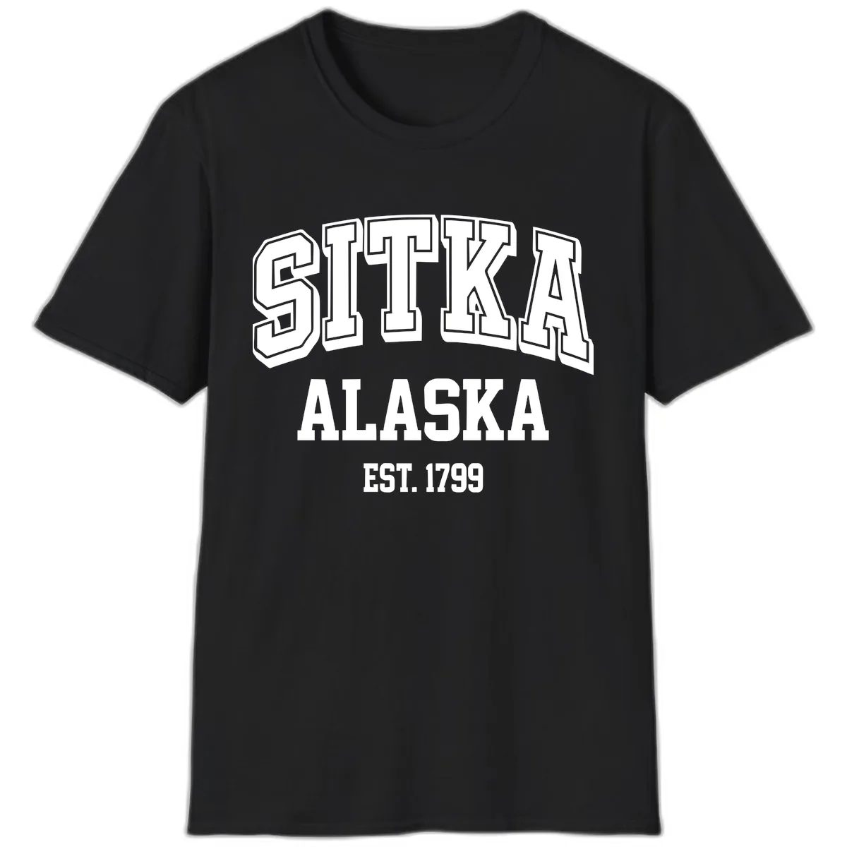 The design prominently displays 'SITKA ALASKA EST. 1799' using a combination of large outlined block letters and solid white lettering.
