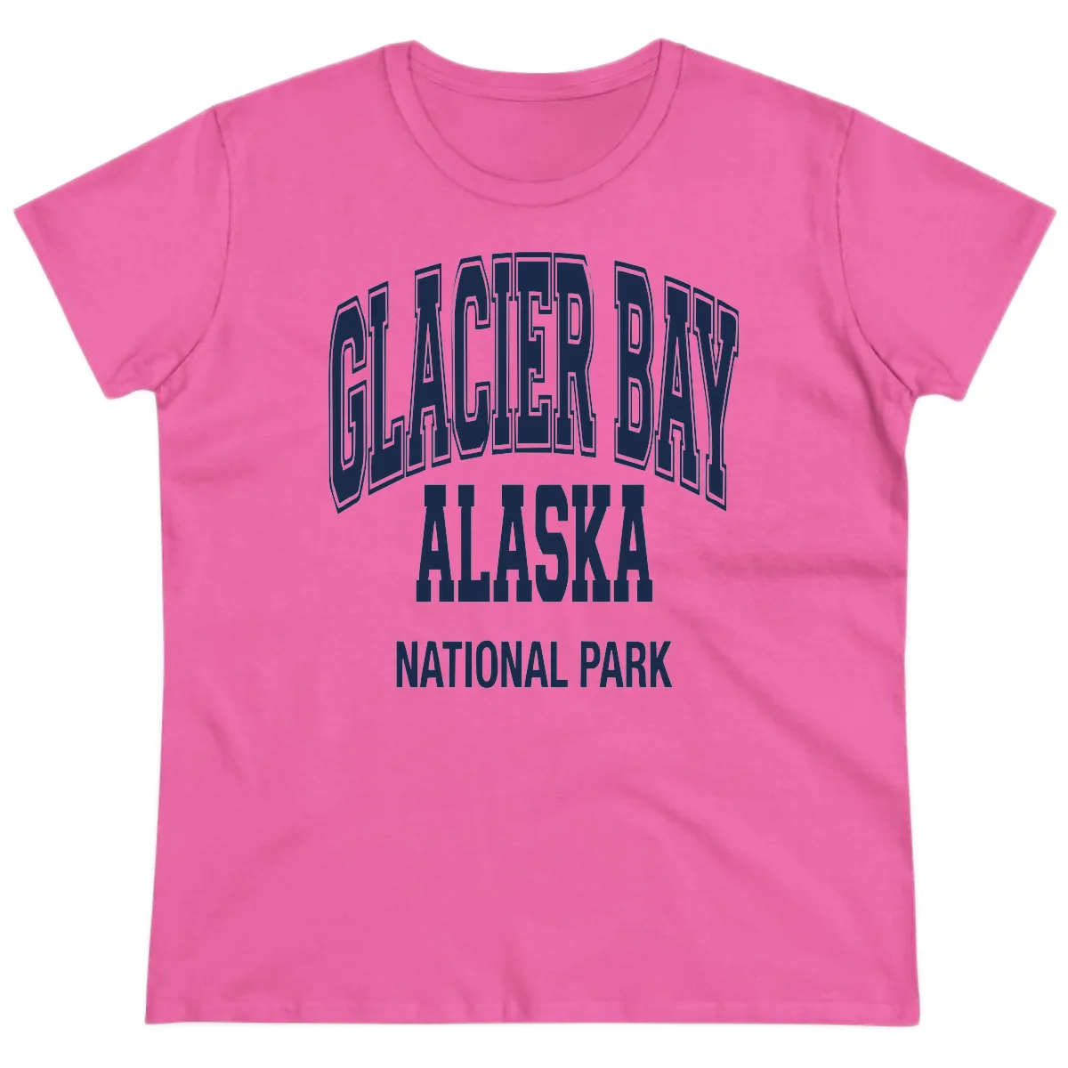 The design features bold 3D block lettering and an icy aesthetic that looks striking on any tee, including this comfortable ladies' fit, highlighting the beauty of Glacier Bay National Park.