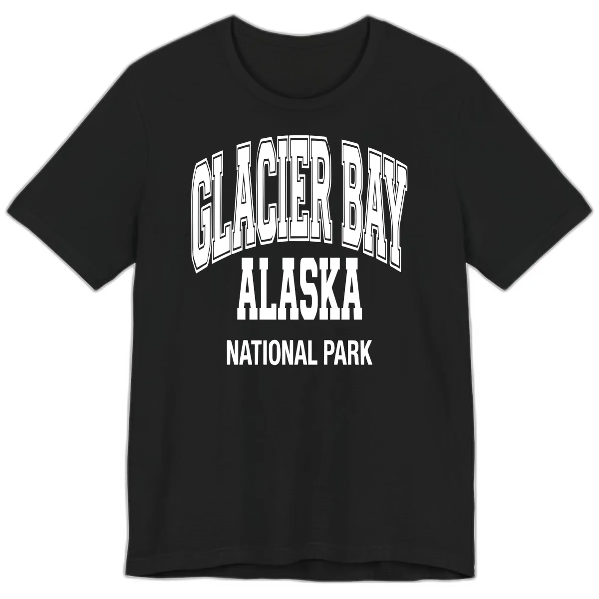 The premium tee showcases the 'GLACIER BAY ALASKA NATIONAL PARK' design with bold 3D block lettering and an icy, dimensional aesthetic inspired by the park's natural beauty.