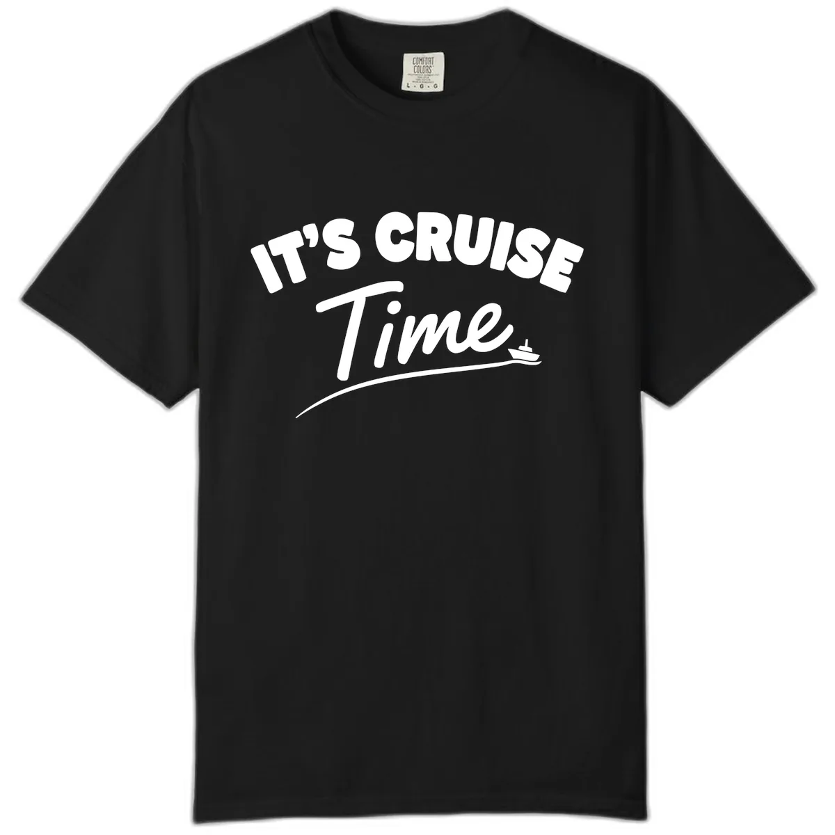 The bold white 'IT'S CRUISE TIME' text, along with the cruise ship illustration and wave line, stands out beautifully against the unique, garment-dyed colors of the Comfort Colors tee.