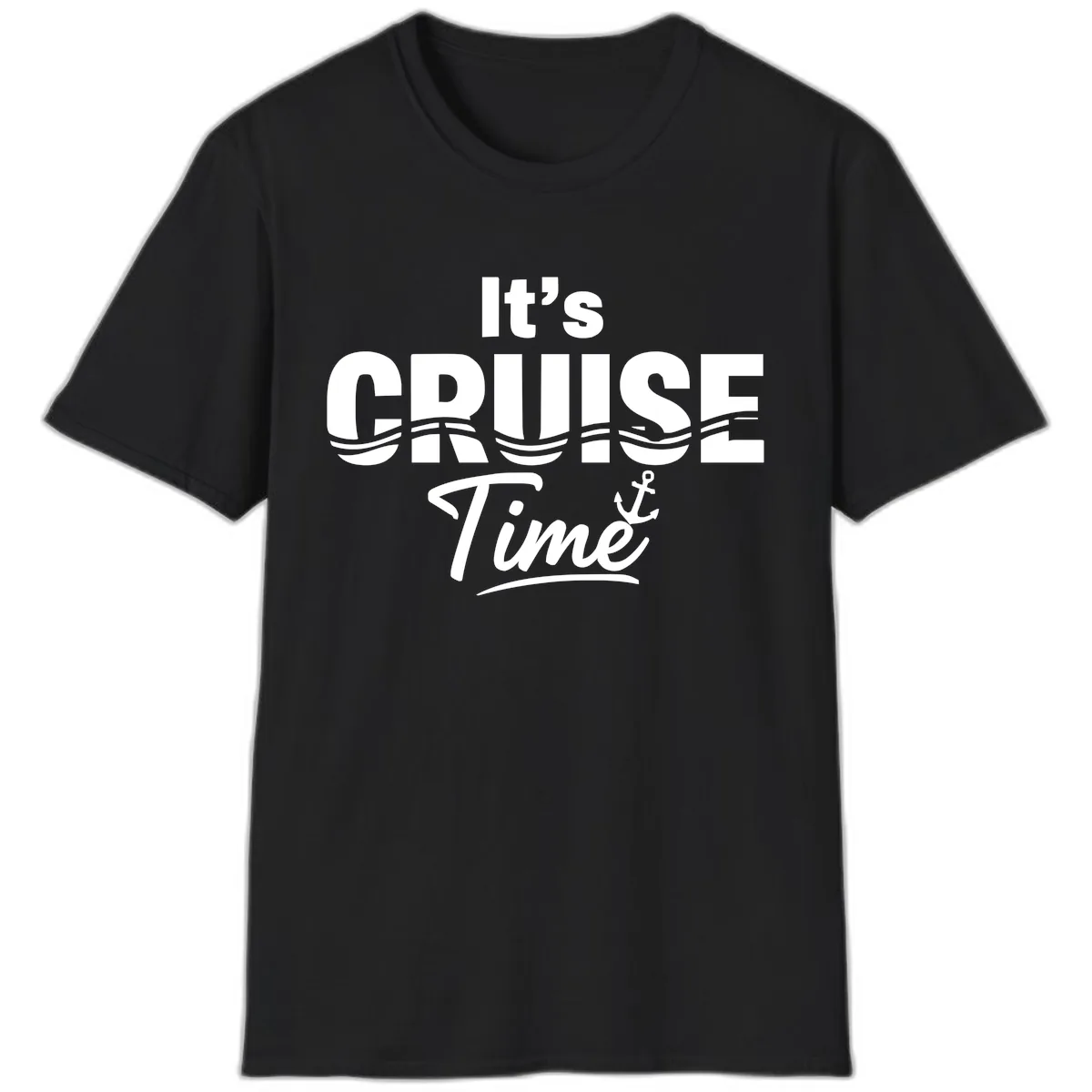 The design features bold, large typography spelling 'It's Cruise Time,' enhanced with decorative wavy lines and an anchor accent. This nautical-themed graphic adds a fun, ocean-ready vibe to your cruise apparel.